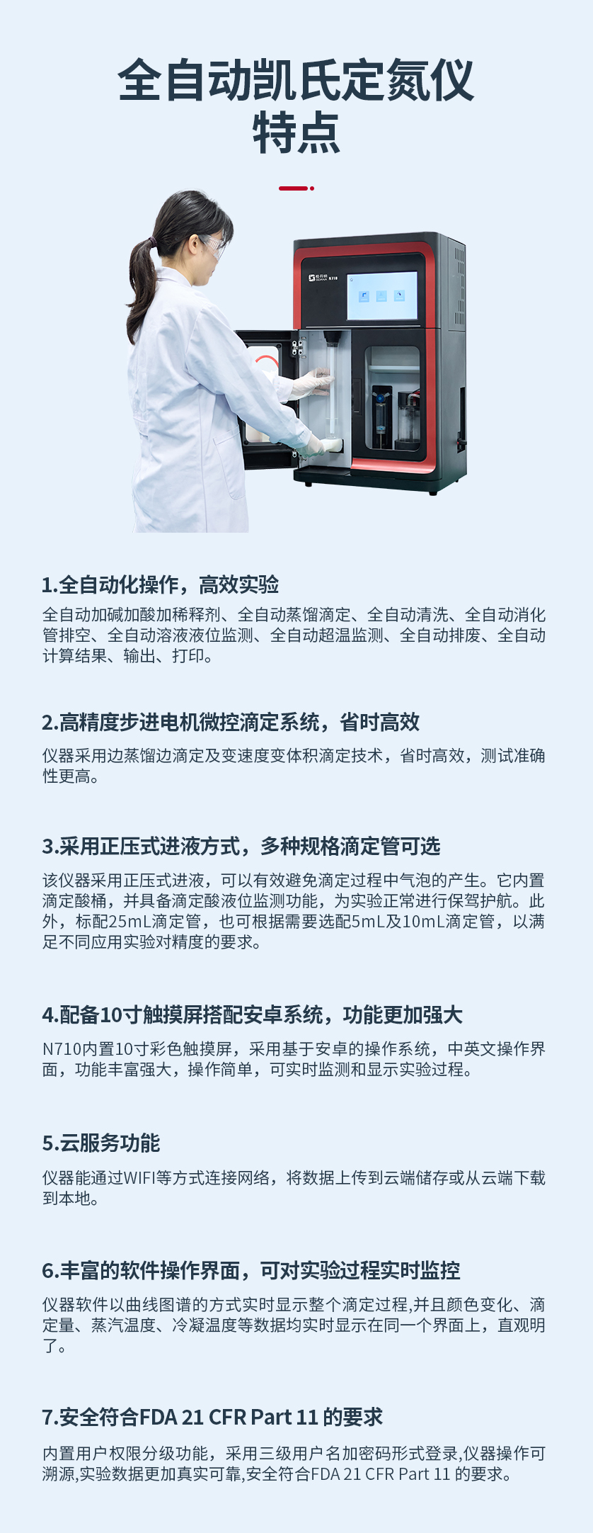 新一代N710全自動凱氏定氮儀集成了自動加堿加酸、自動加稀釋劑、蒸餾滴定、消化管排空、溶液液位監測、超溫監測、清洗排廢、結果計算等功能。采用符合國家標準的凱氏定氮方法:濃硫酸環境消解樣品、堿性環境蒸汽蒸餾、硼酸吸收、加指示劑滴定、終點顏色判定法。